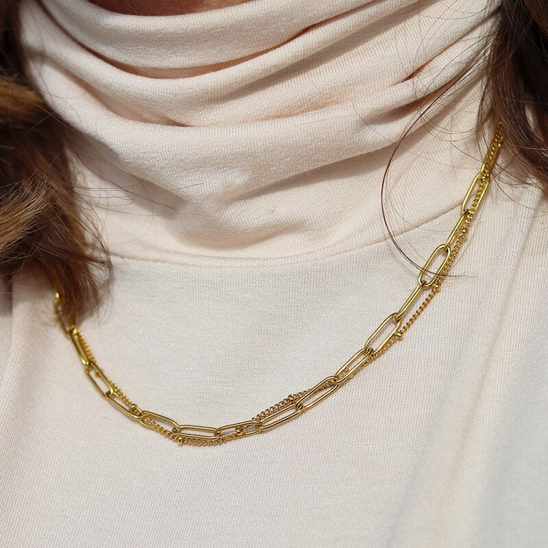 Bu çift katmanlı choker, bu sezonun mutlak trendi. İnce ve kalın zincirlerin birleşimi mükemmel bir uyum sunuyor. Kolye paslanmaz çelikten üretilmiştir, bu nedenle suya dayanıklıdır. Rengi her zaman mükemmel kalır! Görünümünüzü BRAVE bileklik ile tamamlayın.