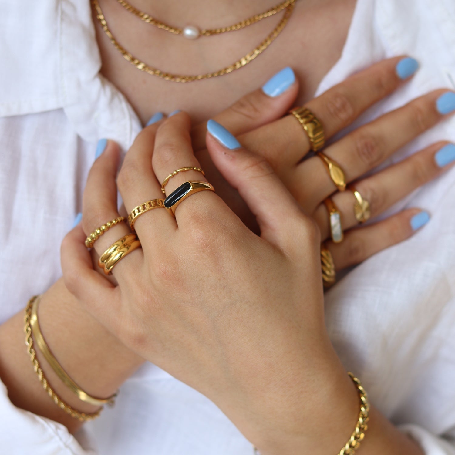 Tüm takılarımız paslanmaz çelikten üretilmektedir. Altın parçalar için PVD altın kaplama uyguladık. Bu, rengin gerçekten uzun süre (en az birkaç yıl) kalıcı olacağı anlamına gelir. Kolayca solmaz ve aynı zamanda çizilmeye karşı dayanıklıdır.