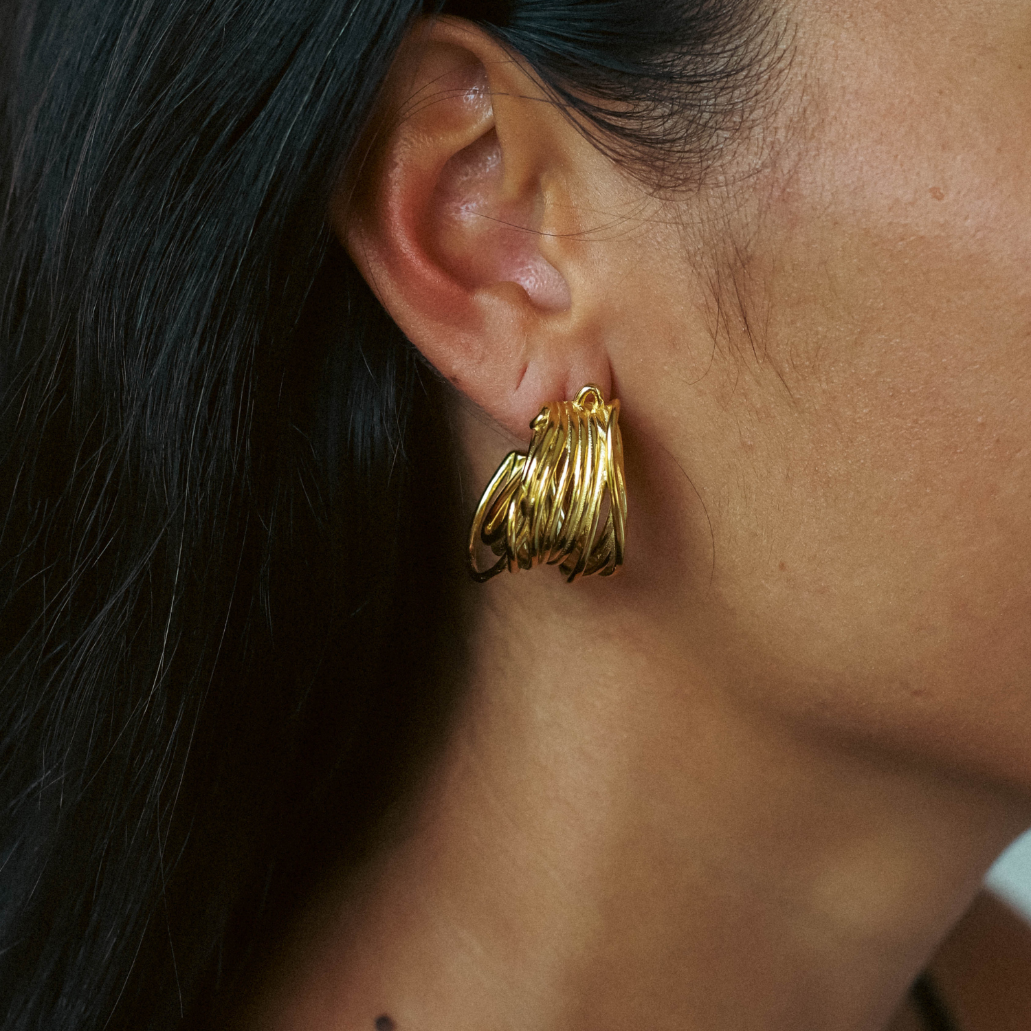 Bükümlü deseniyle öne çıkan bu küpeler, görünümünüze hareket katacak en yeni günlük favoriniz olacak!