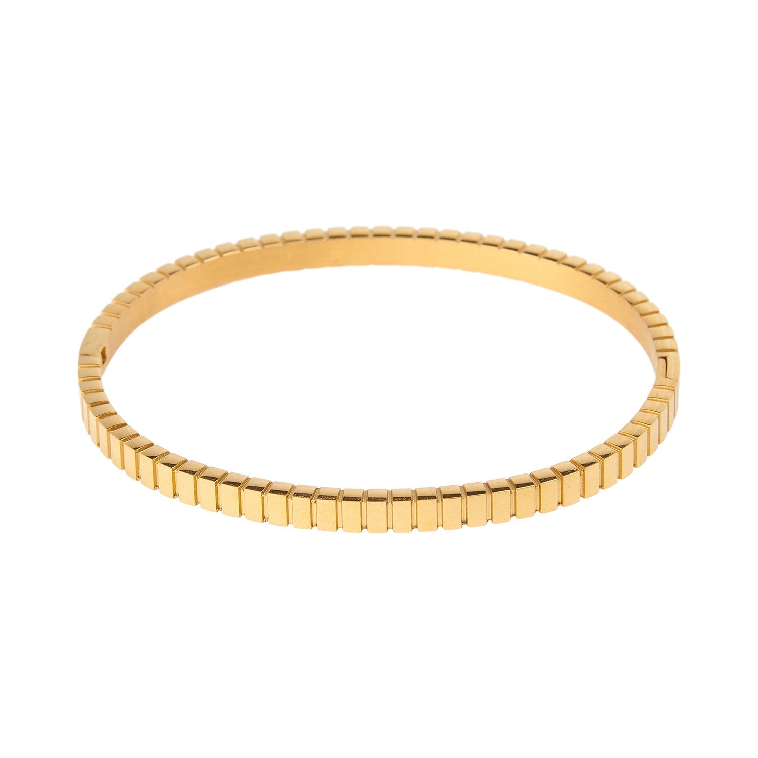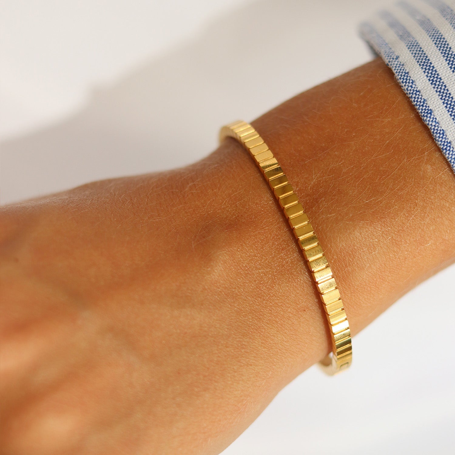 FIT! Klasik bir bilezik, ancak modern bir dokunuşla. Bunu STRIPED. yüzük ve küpelerimizle kombinleyip kullanmaya hemen başlayabilirsin! Bilezik ayarlanabilir değildir ve paslanmaz çelikten üretilmiştir, bu nedenle kararma yapmaz & suya dayanıklıdır.